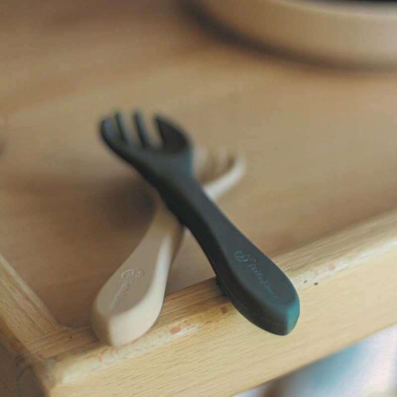 Zestaw składający się z widelca oraz łyżeczki został wykonany w całości z silikonu spożywczego bez BPA. Dzięki temu dziecko może jeść za pomocą sztućców pokarmy zarówno ciepłe, jak i zimne. Elastyczny silikon sprawia, że sztućce doskonale nadają się do wrażliwych dziąseł małego dziecka. Przeznaczone są dla małych dzieci od 6 miesiąca życia, którym wprowadza się rozszerzoną dietę oraz takich które z powodzeniem uczą się już samodzielnego jedzenia. Zaokrąglone kształty i niewielkie rozmiary ułatwiają małemu dziecku nabieranie i spożywanie pokarmu.