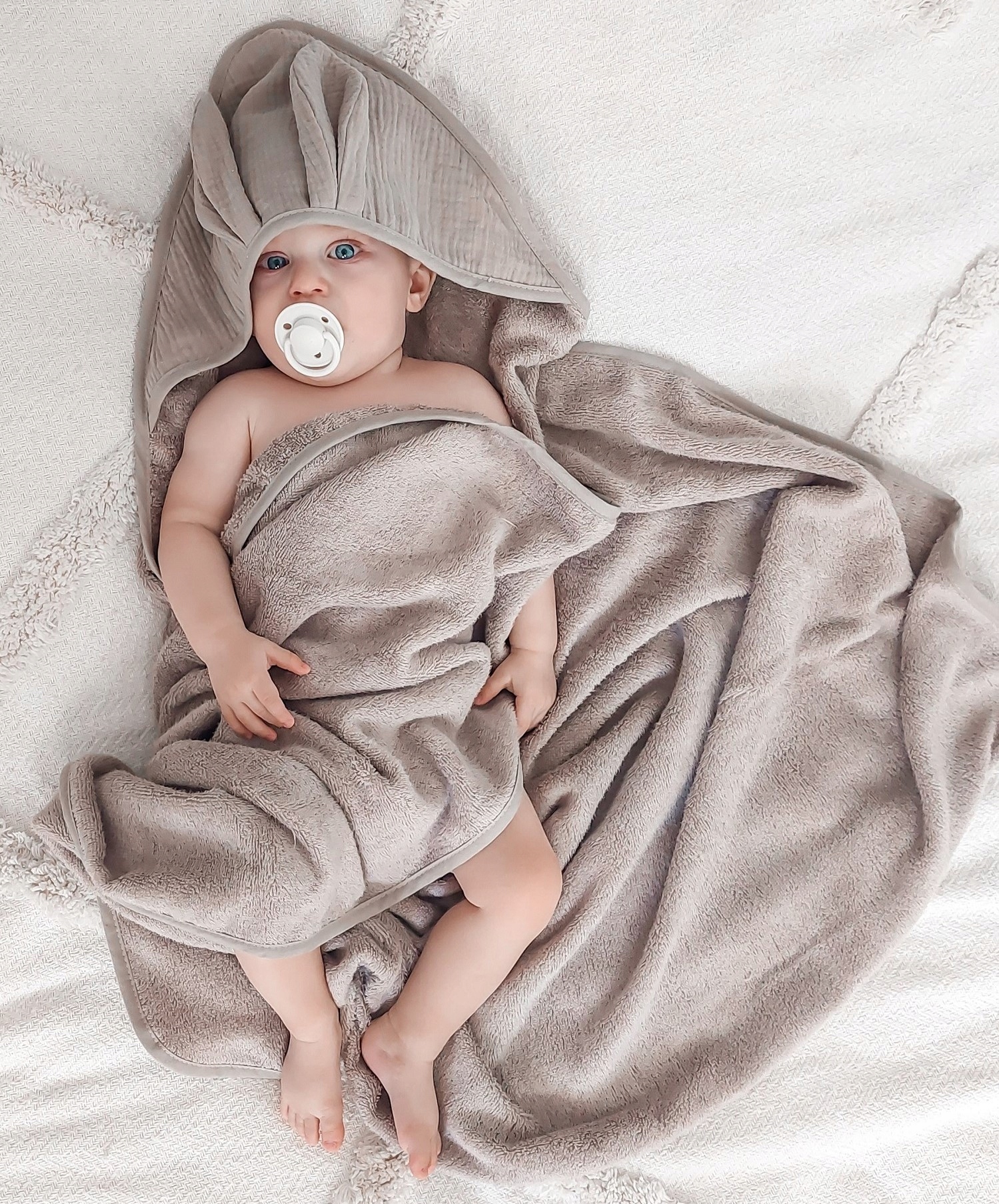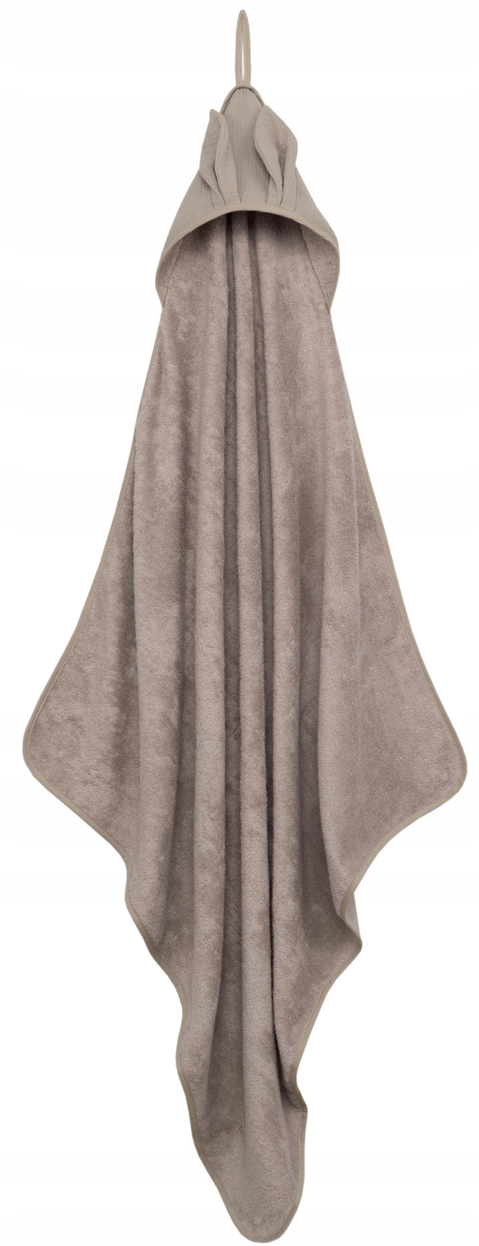 Okrycie kąpielowe uszyte z grubej i mięsistej tkaniny bambusowej i bawełny. Posiada muślinowy kapturek wykończony dekoracyjnymi uszkami.