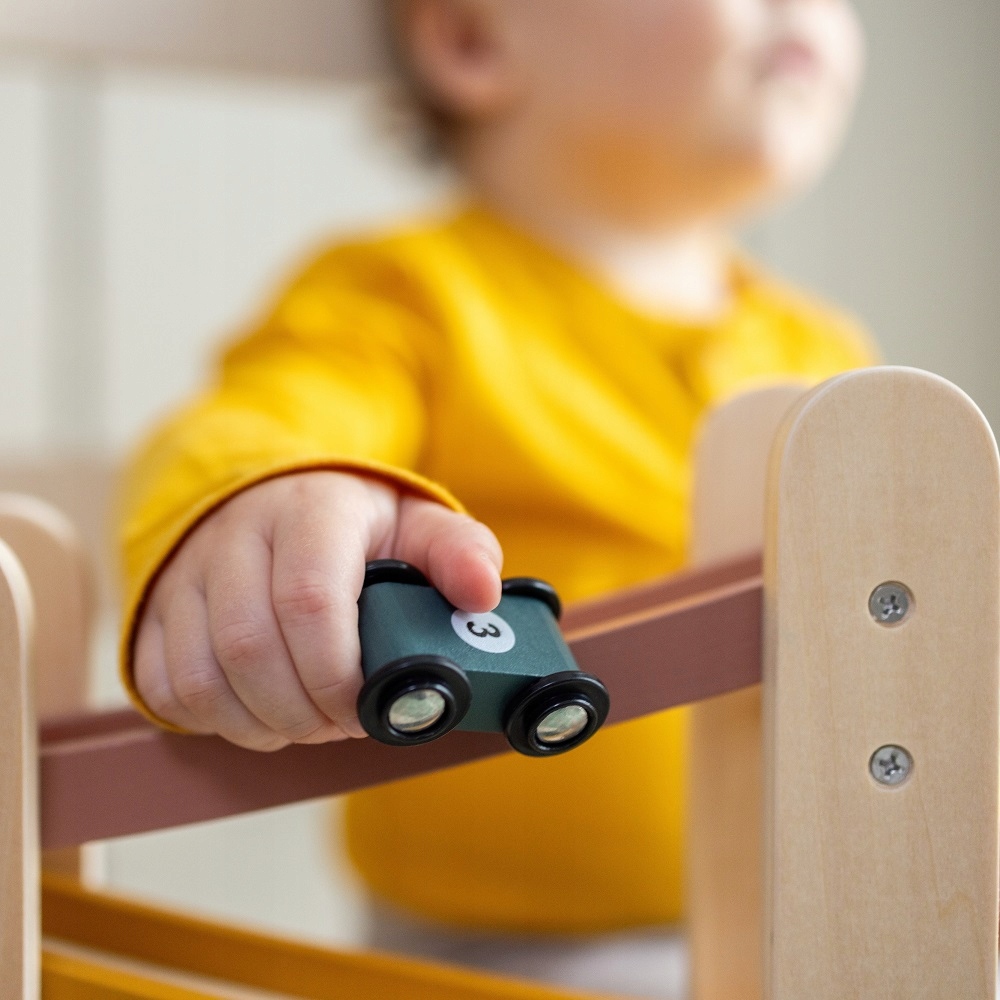 Samochodziki mogą także służyć do samodzielnych wyścigów a minimalistyczny design zjeżdżalni w delikatnych, stonowanych barwach, idealnie wpasowuje się w dziecięcy pokój.